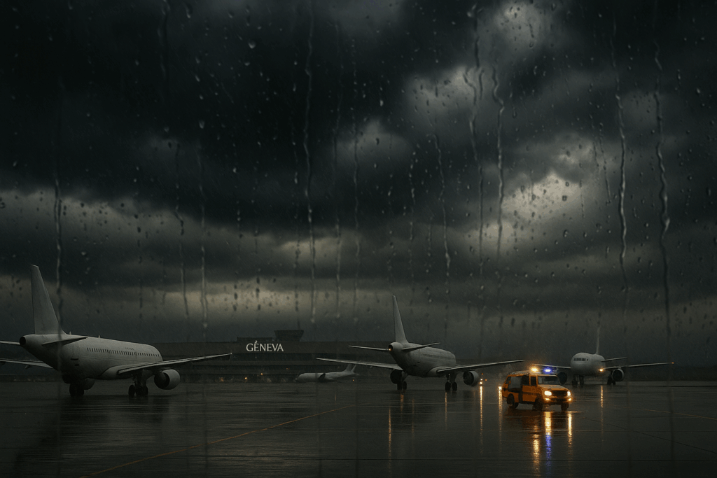 Geneva Airport, Switzerland‘s second-largest air hub, temporarily suspended all flight operations today after violent thunderstorms swept across western Switzerland, causing widespread disruption and damage. The suspension, which began in the early afternoon, left passengers stranded in terminals and forced airlines to reroute incoming flights.